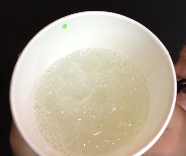 画像は、娘の頼んだカルピス入りの紙コップです。ふちに緑色の液体が見えます。